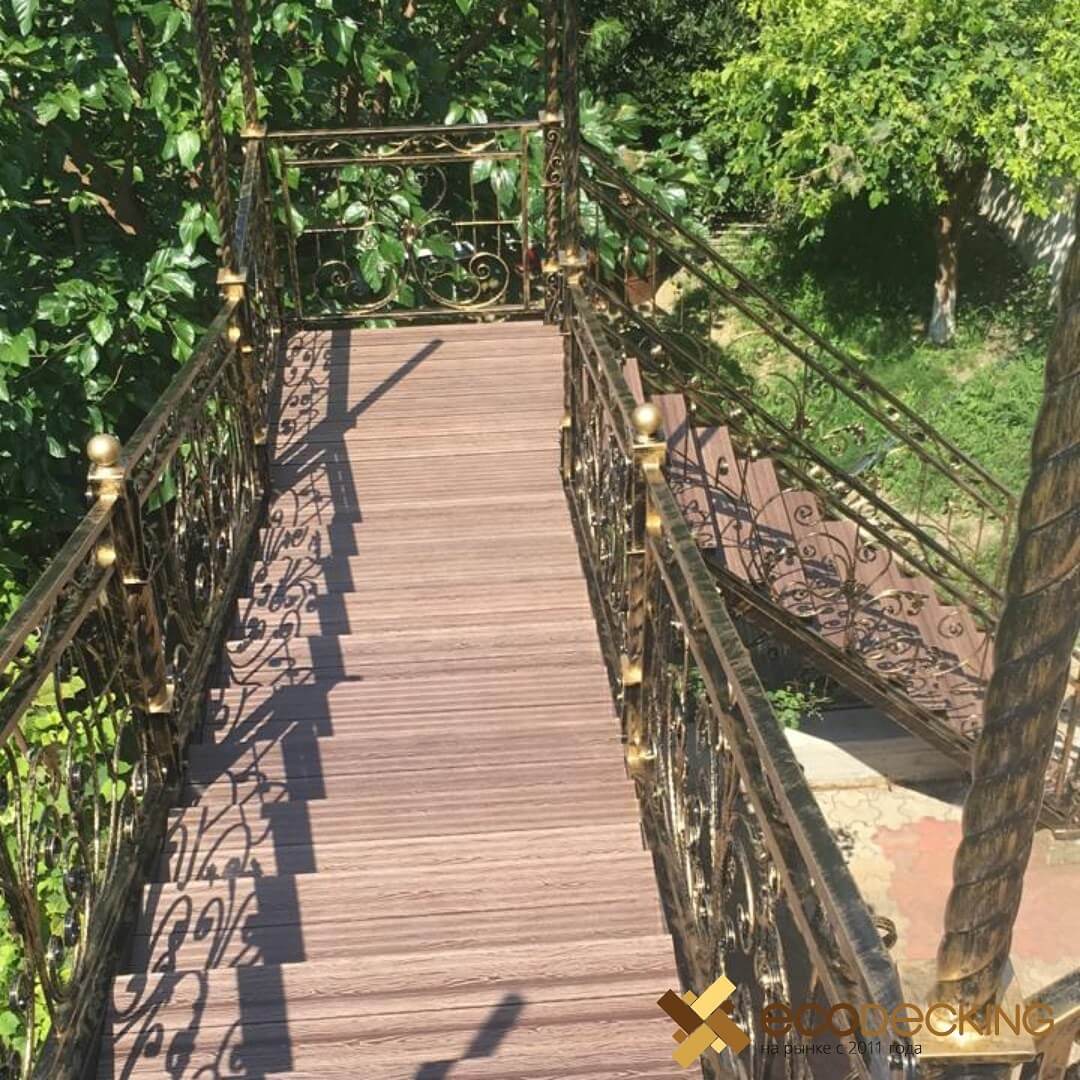 Привлекательность ДПК для строительства лестниц обусловлена тем, что этот материал позволяет реализовывать любые дизайнерские решения. Из декинга можно изготовить такую лестницу, которая идеально впишется в любой проект