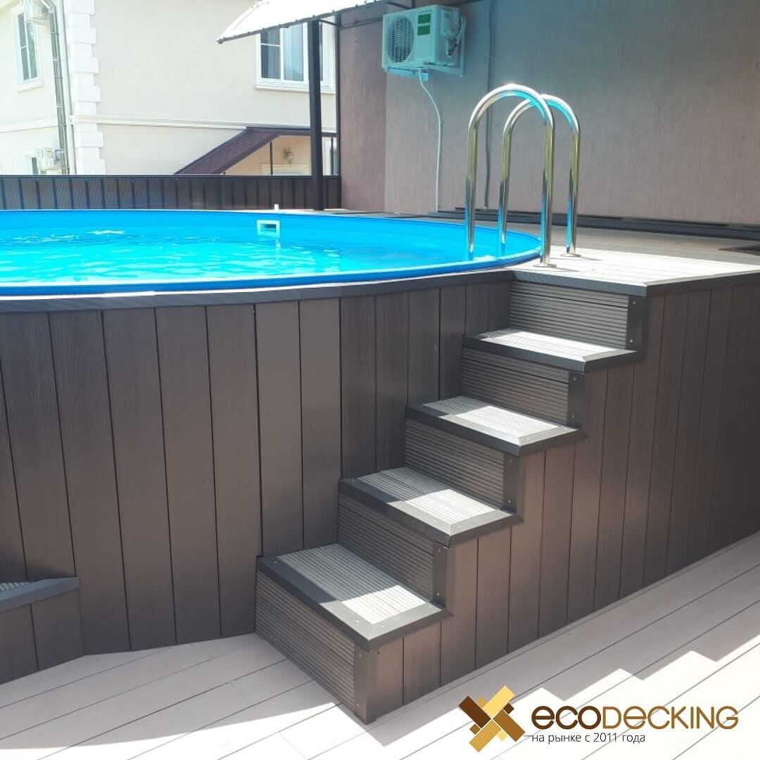 Основным преимуществом применения специальных ступеней из ДПК является их ширина и монолитность